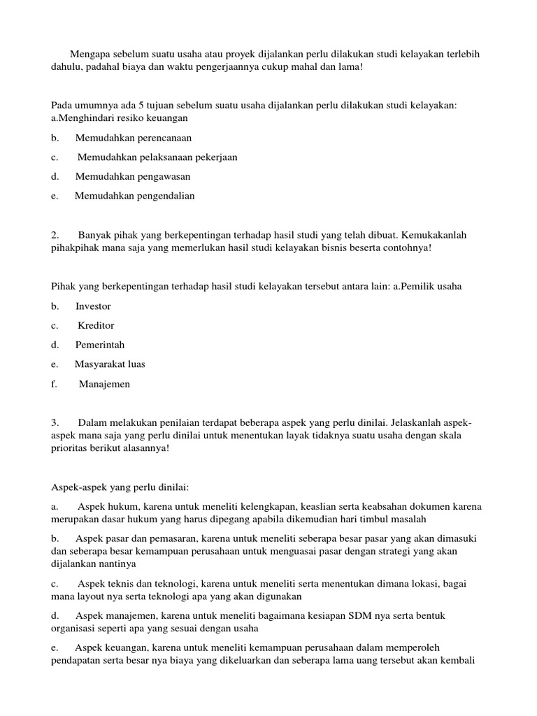 Aspek manajemen studi kelayakan bisnis manajemen. Proposal studi kelayakan bisnis “kedai kopi bang ben” proposal ini dibuat untuk memenuhi tugas kelompok pada mata kuliah studi kelayakan bisnis didi sujadi, s.e., m.m. Jadi pengertian studi kelayakan peroyek atau bisnis adalah penelitihan yang menyangkut berbagai aspek baik itu dari aspek hukum, sosial ekonomi dan budaya, aspek pasar dan pemasaran, aspek teknis dan teknologi sampai dengan aspek manajemen dan keuangannya, dimana itu semua digunakan untuk dasar penelitian studi kelayakan dan hasilnya digunakan untuk mengambil keputusan apakah suatu proyek atau.