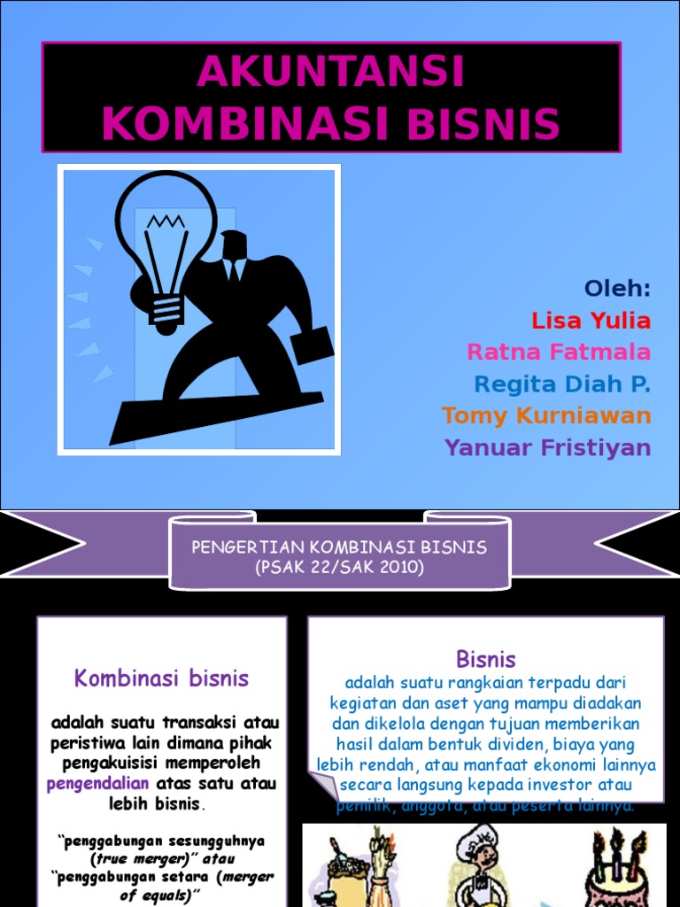 Tomy kurniawan yanuar fristiyan pengertian kombinasi bisnis (psak 22/sak 2010) kombinasi bisnis adalah suatu transaksi atau peristiwa lain dimana pihak pengakuisisi memperoleh pengendalian atas satu atau lebih bisnis. Bab 4 pembahasan akuntansi kombinasi bisnis kombinasi bisnis merupakan transaksi di mana pengakuisisi memperoleh kendali bisnis lain (yang diakuisisi), bisnis adalah serangkaian kegiatan yang terintegrasi dan aktiva yang dapat memberikan pengembalian kepada investor dalam bentuk dividen, pengurangan biaya, atau manfaat ekonomi lainnya. Serta biaya administrasi umum, termasuk biaya pemeliharaan departemen akuisisi internal yang dicatat sebagai beban pada periode akuisisi.